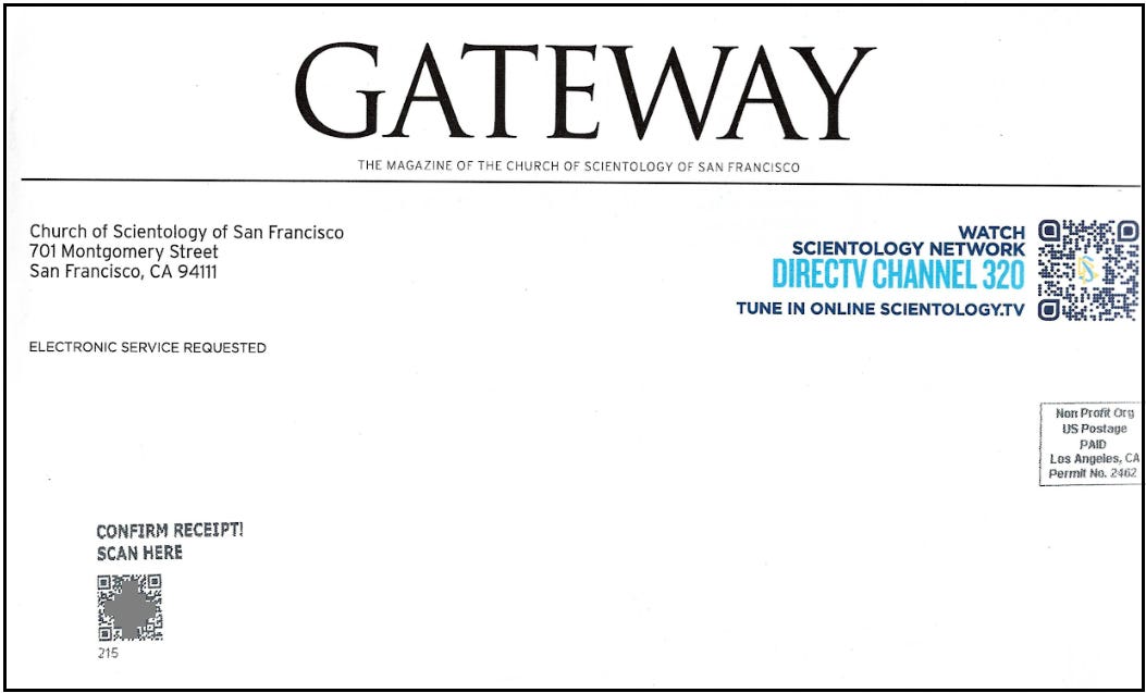 Says our tipster: I received a Scientology publication in the mail yesterday. The mailer contained their usual rag. However, the face of the envelope has a QR code that I have never seen in any mailer before.