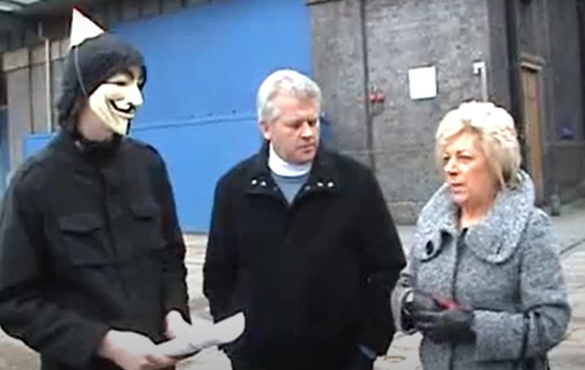 Alex suggested that we ask Pete Griffiths about those demonstrations, when Becky’s parents joined the typically much younger mask-wearing Anonymous protesters.