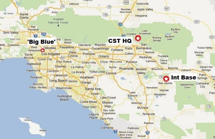 [In this map, you can see the location of Scientology’s Los Angeles headquarters, “Big Blue,” and about 90 miles east the location of its international management base, Int Base, near Hemet. “The Hole” is located at Int Base, the place where Shelly was living until 2005 when she vanished. Shelly was then moved to the CST headquarters near Lake Arrowhead, a tiny compound about 60 miles northwest of Int Base and marked on the map. That’s where Shelly has been for the last 17 years.]