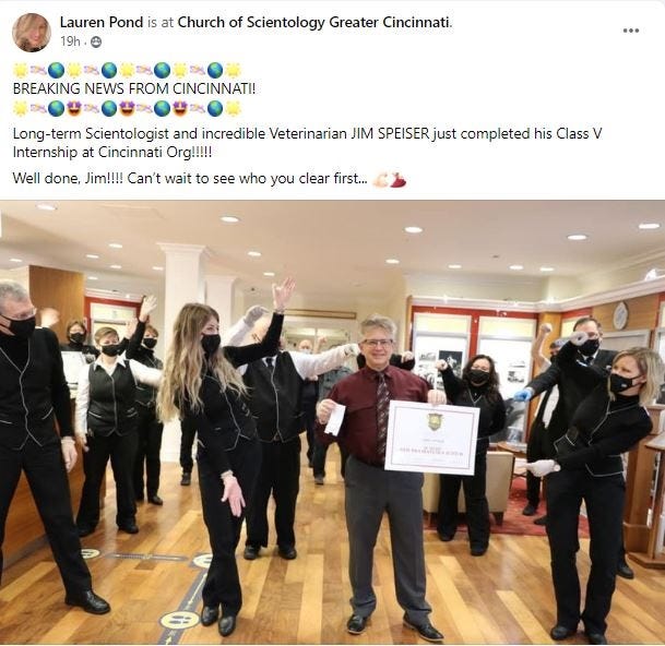 Jim made his first appearance here at the Underground Bunker in January 2021, when he was featured for completing his Class V auditor “interneship.” So at the same time he owned and ran a major vet hospital in Indianapolis, he was training to be a Scientology auditor at the Cincinnati Ideal Org (which is actually across the river in Florence, Kentucky).