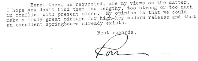 Here, then, as requested, are my views on the matter. I hope you don’t find them too lengthy, too strong or too much in conflict with present plans. My opinion is that we could make a truly great picture for high-key modern release and that an excellent springboard already exists.