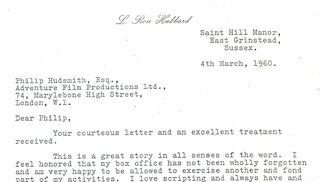 It’s a 4-page letter dated March 4, 1960 from Hubbard’s Sussex estate, Saint Hill Manor. Hubbard, of course, is flattered that he’s been chosen for the project, and so he can’t help waxing nostalgic about his Hollywood work as well as griping that greater success had eluded him, which he tends to blame on “Ed Muhl, manager of Universal-International.”