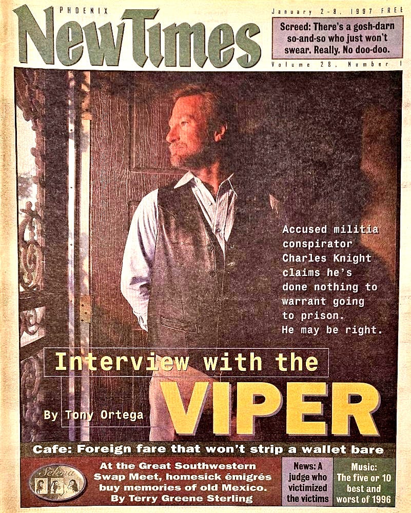 This story was originally published on January 2, 1997 in the Phoenix New Times. At the time, the arrest of the Viper Militia was one of the biggest national stories to come out of Arizona, and every journalist in town wanted the same thing: An interview with one of the militia members who had been charged and were facing trial. We managed to be first with this lengthy profile of Chuck Knight. As part of our Saturday bonus story program, we decided to bring this article over to our Substack so it has an easier-to-read, ad-free archival home. — T.O.