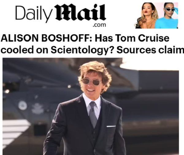 You’ll have to forgive us that we didn’t get to this sooner, because we were just out of surgery and lying rather helpless in a hospital bed last week when the Daily Mail’s entertainment gossip columnist Alison Boshoff “reported” that Tom Cruise has stopped going to Scientology’s UK headquarters for the past three years.