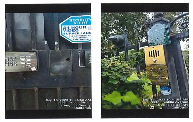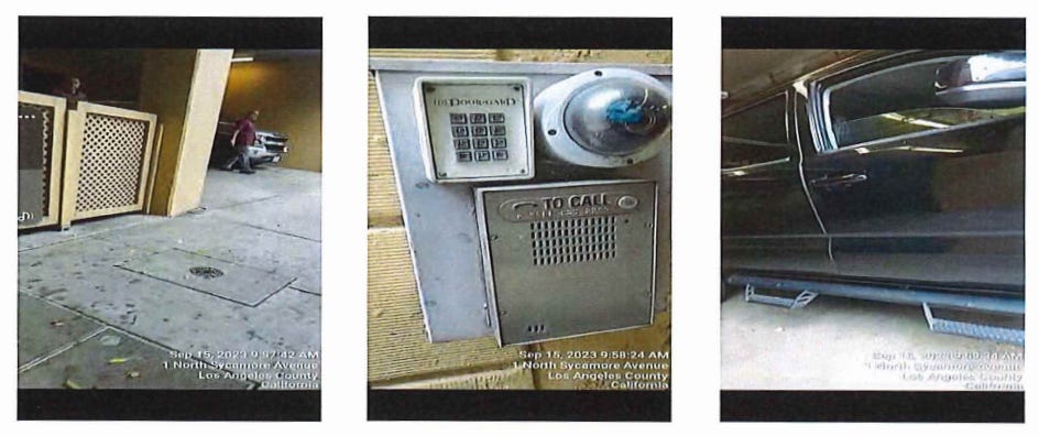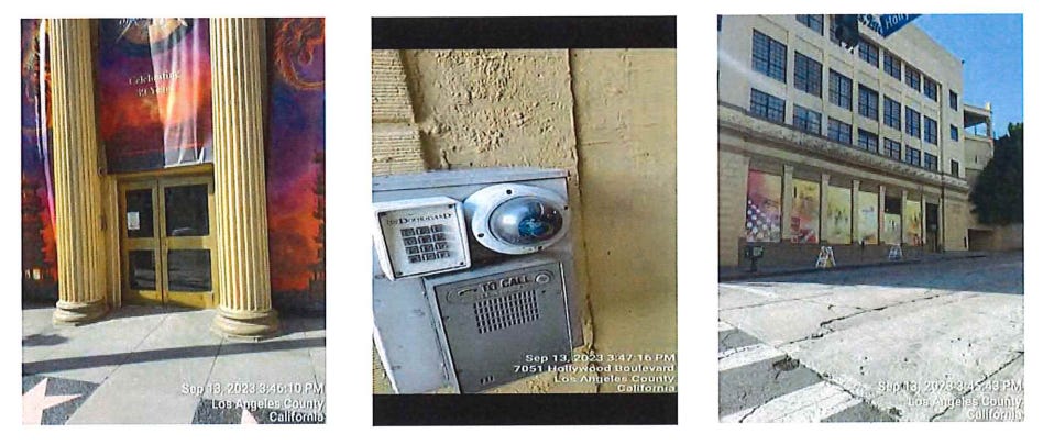 Results: The intercom at the Hollywood Blvd entrance does not work. There is a folding partition barrier just inside the front double doors which appear to not be in use. On the Sycamore Ave side of the building there is an intercom and camera at the driveway to the parking structure only, no formal entry/exit doorway other than what looks like one set of exit only double doors. The intercom rang and rang, hung up and auto redialed over and over for about four and a half minutes, there was no answer, no activity observed.