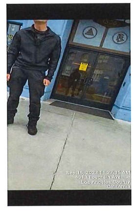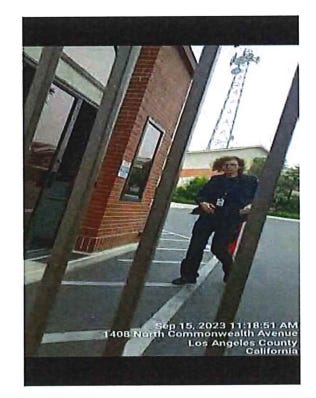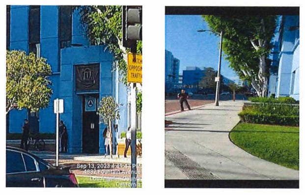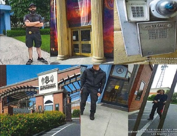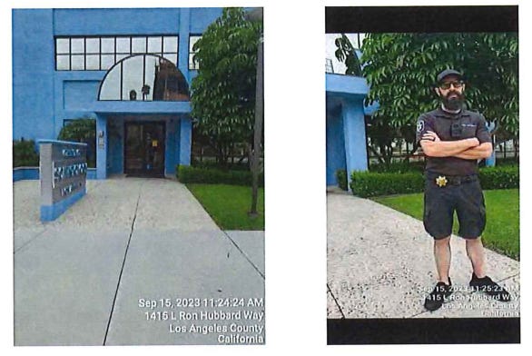 Results: I approached the side entrance on Tamarind Ave and was met by plain clothes security guard, it was Chuck again (white, male, 65 yrs, 5’10”, 195 lbs, gray hair, sunglasses.) He said what can I do for you? I explained that I was a process server there to serve David Miscavige and I asked are you in charge of the property. He said I am hired private security, and I can tell you that he is not here. I asked if there was a manager that I could talk to? He said they're not going to come out. I asked, can I go in? He said oh God, no and repositioned himself more between me and the entrance. I explained I am not trespassing while serving legal process, He said they do not want you on the property - I understand, I know your job. I announced that I was substitute serving him on behalf of David Miscavige with summons and complaints for two lawsuits. He backed up and would not take the documents so I dropped them at his feet.