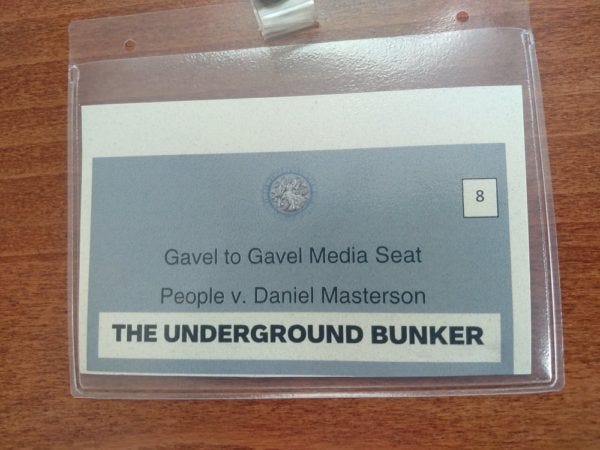 This badge will assure us a seat in the media section throughout the trial, and we expect it to be packed with other reporters.