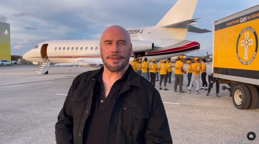 Well, John himself settled that question yesterday when, just like he did after the Haiti earthquake a decade ago, he posed in front of Scientology “Volunteer Ministers” loading a plane with material to help out with Hurricane Ian devastation.