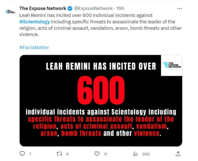 An official statement issued by Scientology after the lawsuit asserted that Ms. Remini’s statements had “generated threats of and actual violence against the Church and its members as evidenced by multiple criminal convictions of individuals poisoned by Remini’s propaganda” and suggested that she consider emigrating to Russia.