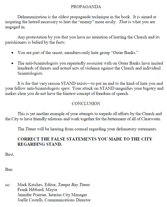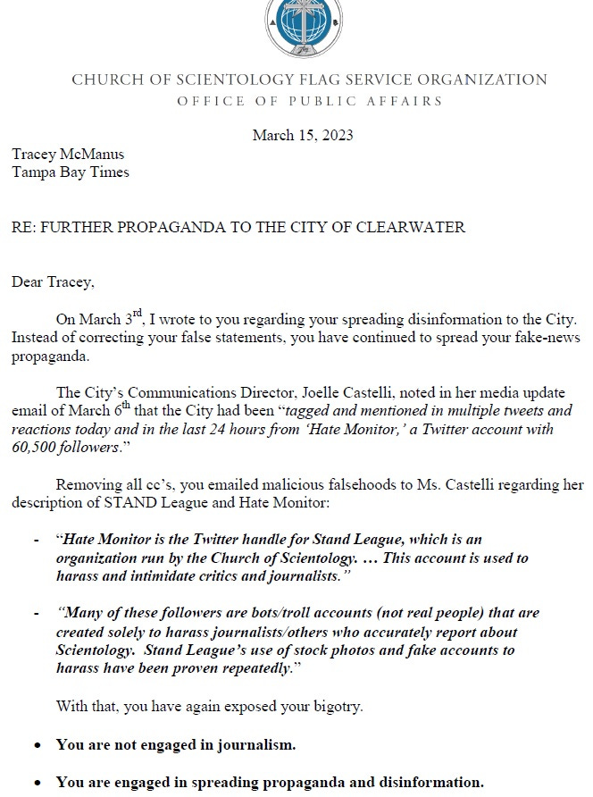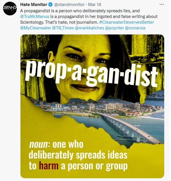 Tampa Bay Times reporter Tracey McManus helpfully explained to that city official that Hate Monitor is operated by Stand League, a propaganda effort of the Church of Scientology.
