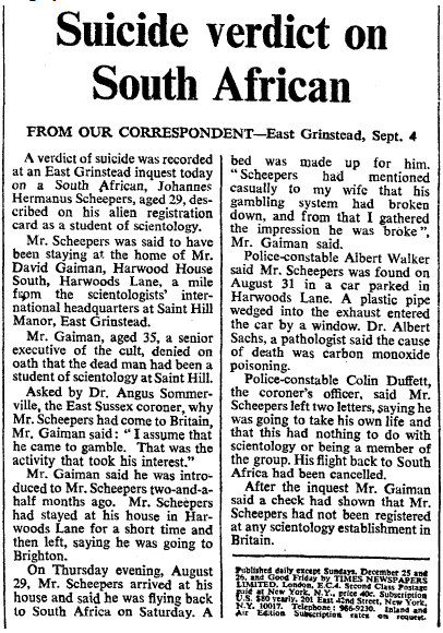 To help make ends meet, the Gaimans took in lodgers among the Scientology students who had come to Saint Hill. And one of them, a 29-year-old South African man named Johannes Hermanus Scheepers, was found dead in the Gaiman family Mini on August 31, 1968. According to an article written at the time, Scheepers had connected a hose from the car’s exhaust to its interior, and had died of carbon monoxide poisoning…