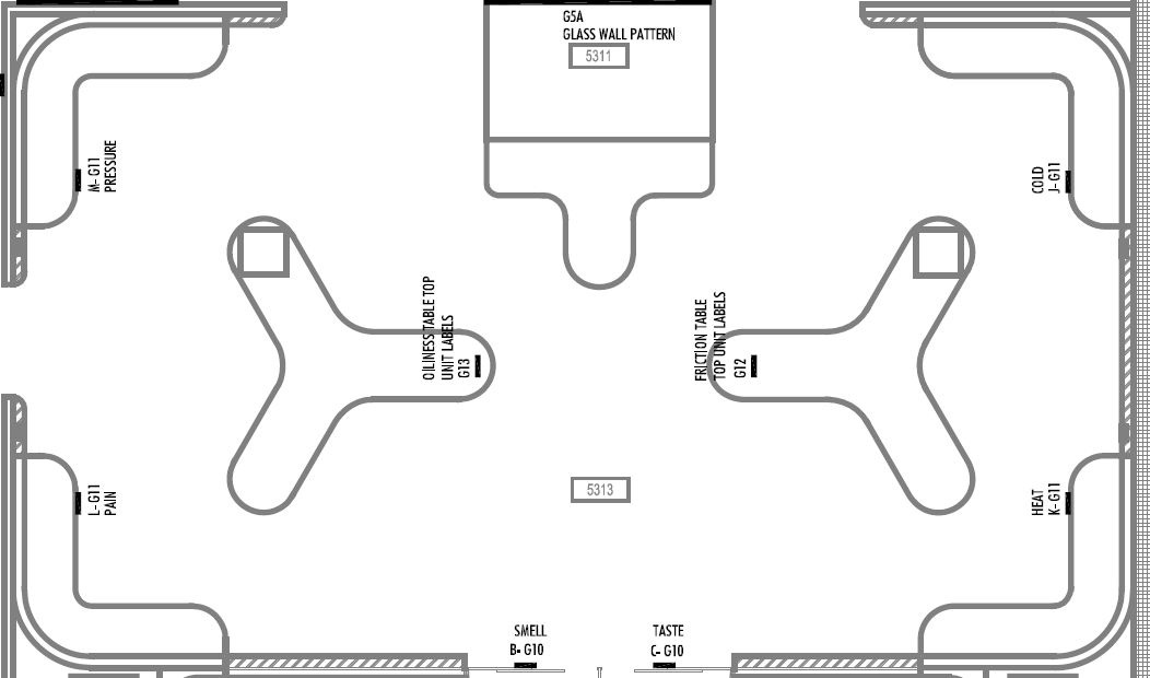 Getting back to oiliness -- we just can’t seem to get enough of it -- let’s put that oiliness table in some context. Here’s an overhead view of one room in the fifth floor “perceptics” section, and you can see that the oiliness table shares space with a “friction table,” as well as four other stations: heat, cold, pressure, and pain. (At the bottom, you can see the doors to the smell and taste walls.)