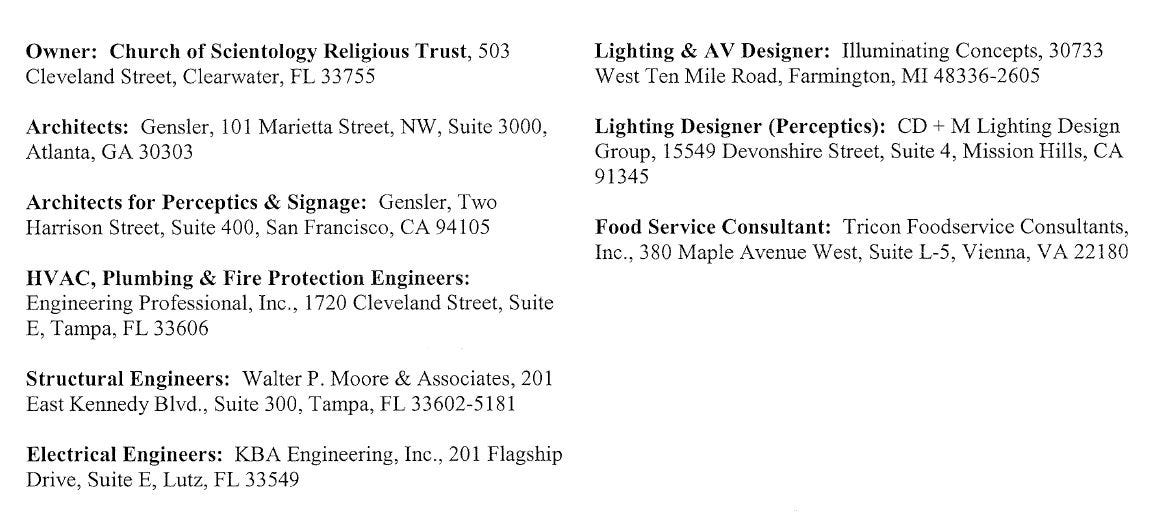 Before we show any more images, however, we thought we’d roll credits first. As in, we found this list of who was responsible for turning church leader David Miscavige‘s dreams into reality. As of 2009, these were the firms on board...