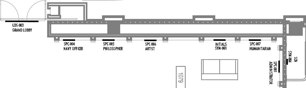 Let’s go back to the first floor, where there’s a lot of nostalgia going on for L. Ron Hubbard and his days at sea. First, we noticed this grand wall of tributes to the Commodore and his many accomplishments. The wall is so long, we had to snip it into two different scans, first the left portion and then the right, with a grand entrance into the Atrium between them...