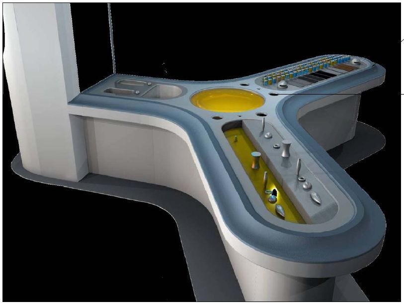 We also looked for other views of some of the equipment that has already puzzled and excited us. Here’s another schematic of the intriguing Endocrine States room, which is looking more and more like the Tilt-a-Whirl we remember from those sketchy carnivals that would come and set up down at the school parking lot once in a while...
