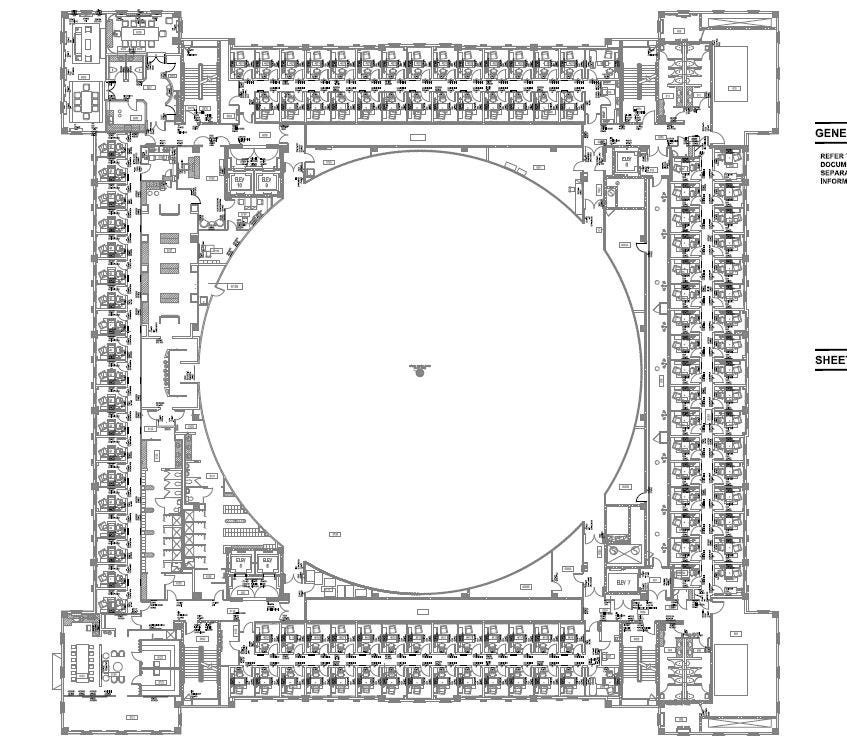 Now, we’re going to reproduce the entire sixth floor’s schematic so you can see just how much space is dedicated to that running dome in a building that takes up a full city block. Those tiny rooms that surround the running space are all auditing chambers. Hundreds of the little rooms are also found on other floors — Miscavige is optimistic about the huge numbers of people he expects to use this facility.