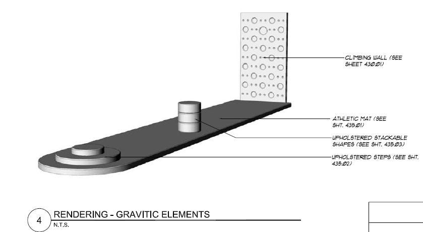 Another of L. Ron Hubbard‘s 57 “perceptics” — human senses — he called “gravitic.” We found this rendering of the fifth floor’s “gravitic elements” installation, and that vertical portion with holes is referred to as a “climbing wall.”