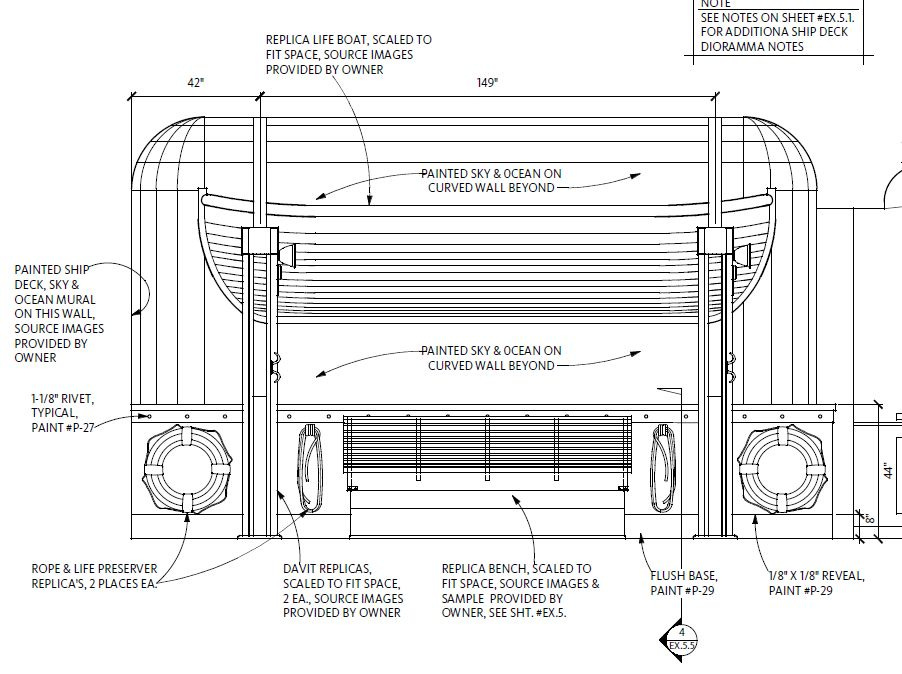 And we were a little surprised that readers didn’t seem to have more to say about the small Sea Org museum outside the Commodore’s office, which includes a diorama of what it was like to sail on the Apollo back in the day. The recreation of a deck from the ship includes an actual lifeboat replica, and here’s a schematic…