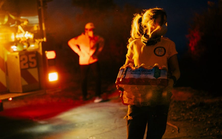 Deep in those devastated hills, a van driven by Scientology Volunteer Ministers (VMs) had been granted entry past the checkpoints guarded by the Los Angeles Fire Department and the National Guard. Their mission was to deliver supplies to first responders at the frontline — water, protein bars, hot food or medicine, whatever was needed.