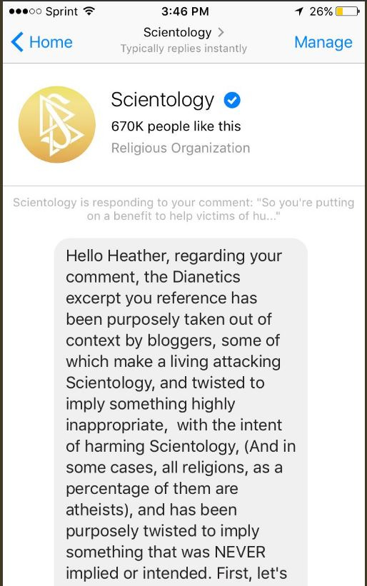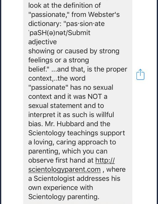 Even Scientology didn’t try and deny that it said what it says. One of Scientology’s social media accounts, in 2017, claimed that the word “passionate” in the passage meant something else in 1950 when Hubbard used it…
