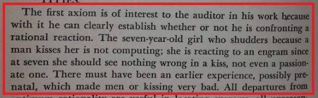 The seven-year-old girl who shudders because a man kisses her is not computing; she is reacting to an engram since at seven she should see nothing wrong in a kiss, not even a passionate one. There must have been an earlier experience, possibly prenatal, which made men or kissing very bad.
