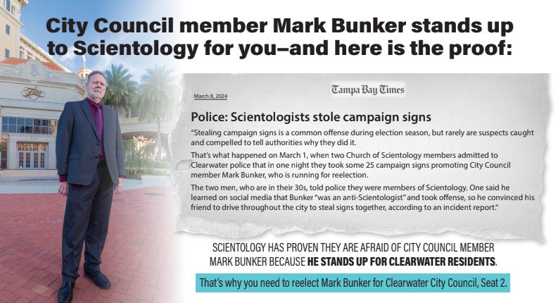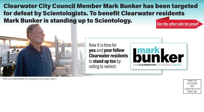 Best wishes for Mark Bunker in his campaign. He is for the citizens of Clearwater, the criminal organisation known as the “church” of $cientology is against.