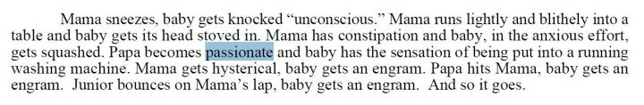 Of course, this excuse is pure bullshit. Hubbard himself used the word passionate with a sexual meaning, and he did so elsewhere in Dianetics, referring to one of his favorite examples of an engram, when mom and dad have rough sex while you’re being bounced around in the womb…