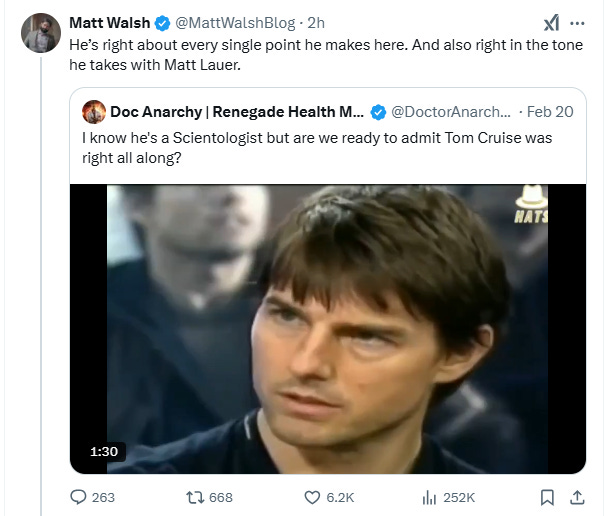On Thursday, a Twitter account that calls itself “Doc Anarchy” posted a 2-minute video edit of the infamous 2005 Today Show interview of Tom Cruise berating host Matt Lauer about psychiatry with the tag, “I know he’s a Scientologist but are we ready to admit Tom Cruise was right all along?” The post went viral, with 1.5 million views so far.