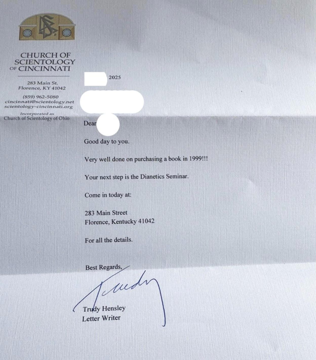 So from time to time, bizarre letters written by Scientologists end up online with their strange pitches to try and “recover” people to Scientology, and this new example was particularly strange because the person the letter was addressed to is apparently no longer among the living…