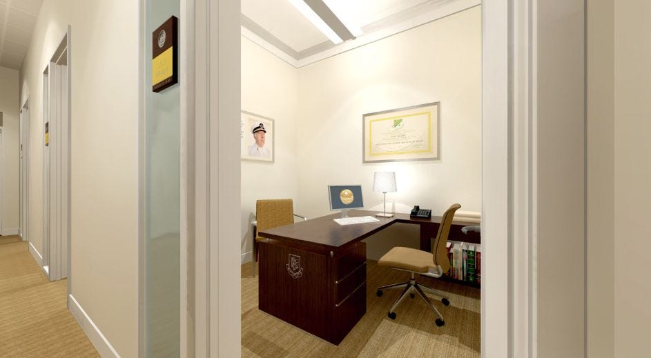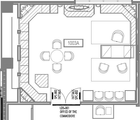 However, we do want to provide some limited glimpses at that material — call it fair use. For example, if you go into the building at its grand entrance on its northwest corner, then hook a left around the reception desk to a door that pulls open toward you, then make another left, you’ll find yourself at the door to the Commodore’s Office.