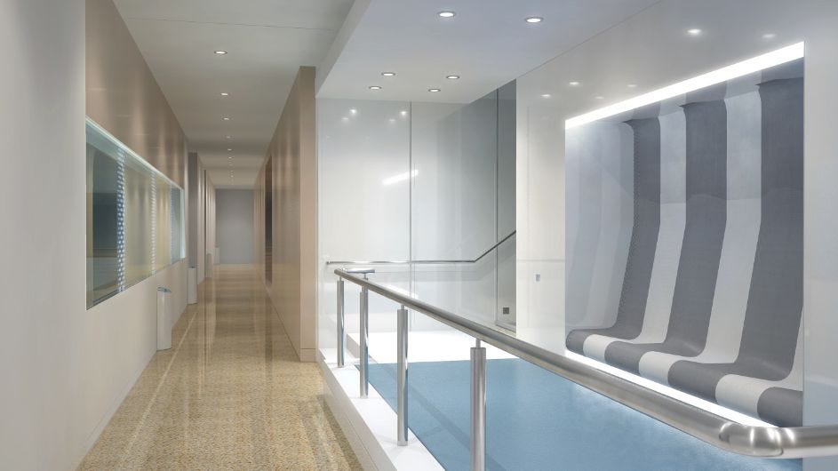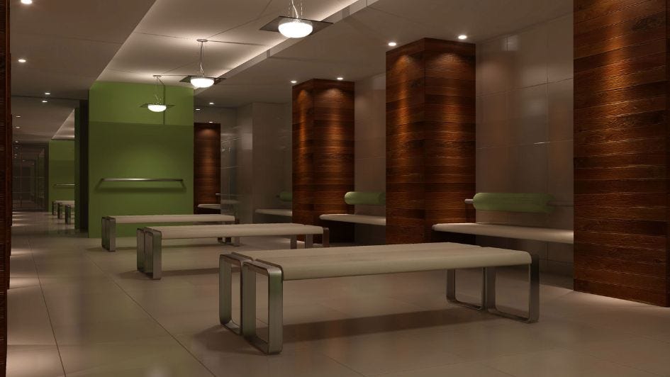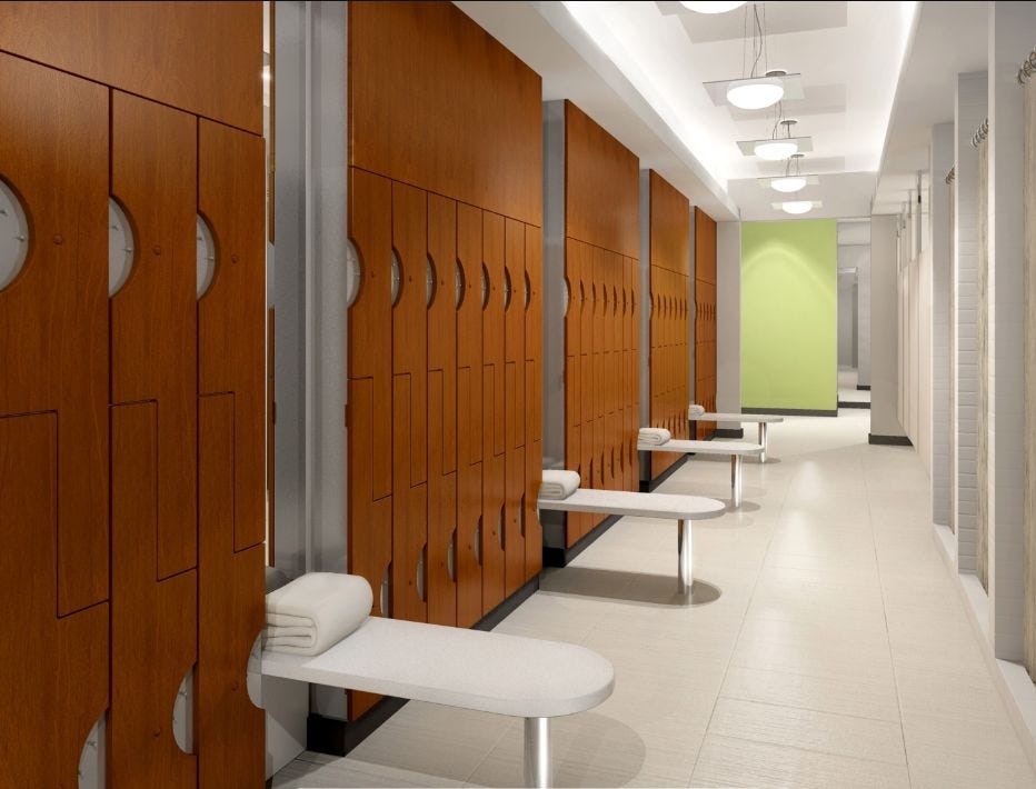 Now let’s go to the sixth floor, which has one of the strangest features in the entire building. Most of this floor consists of one giant, circular space. And before we show it to you, consider these fancy gym changing rooms outside...