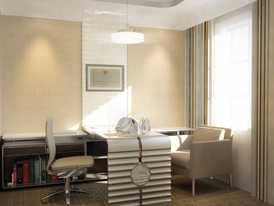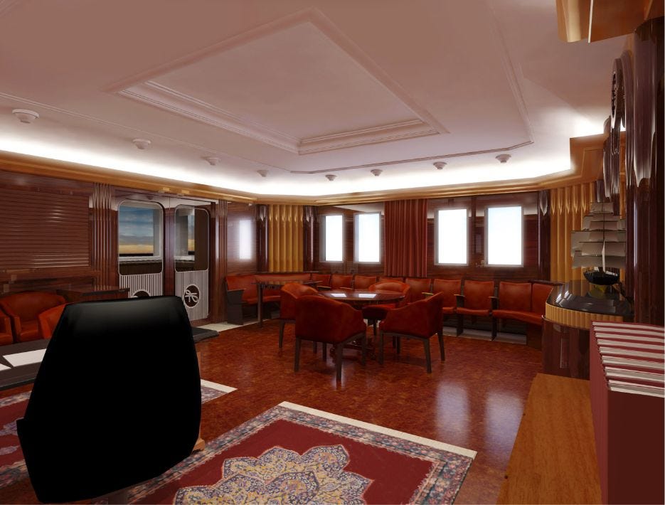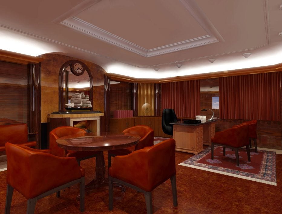 Here’s the office in a couple of renderings. First, a view from left of the entrance, looking at Hubbard’s desk to the right, and a ship model on the far wall...