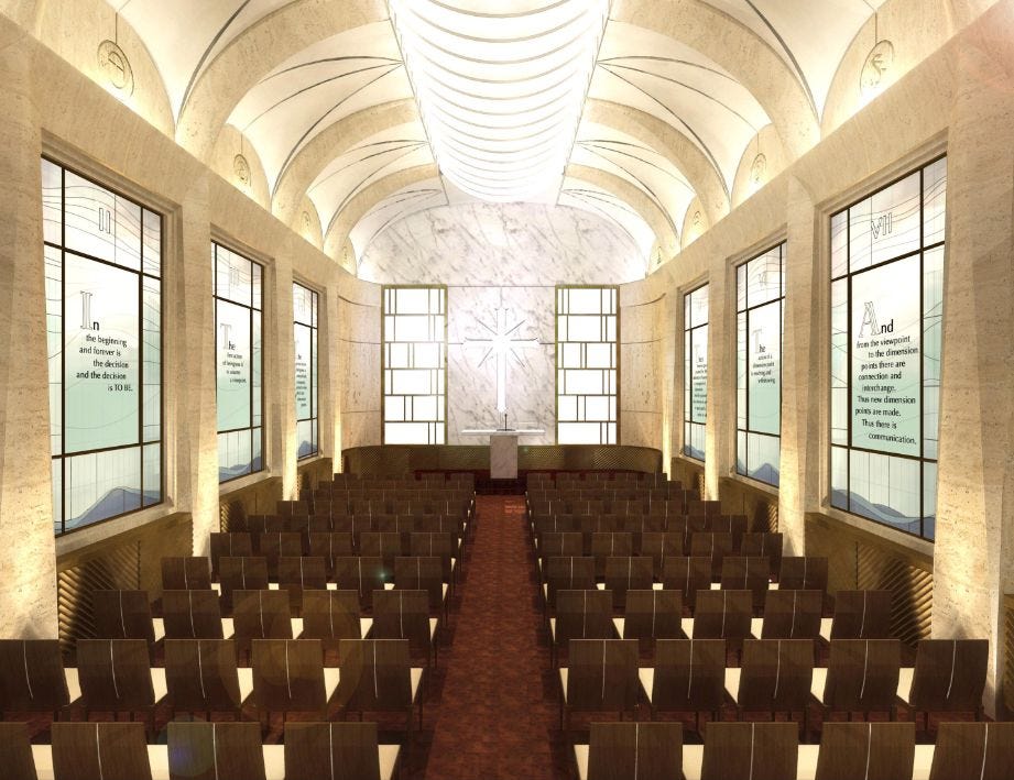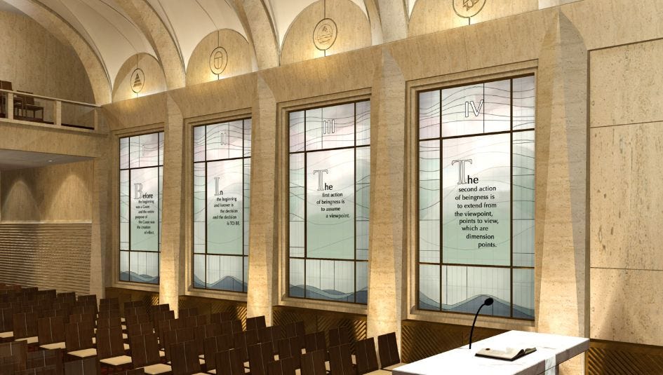 “It’s just a show, but some people go on Sunday for the show,” he says. Weddings are also held in the chapel. Here’s another view, with a better look at some of that timeless Hubbard wisdom etched on the windows: One of them appears to read, “In the beginning and forever is the decision and the decision is TO BE.”