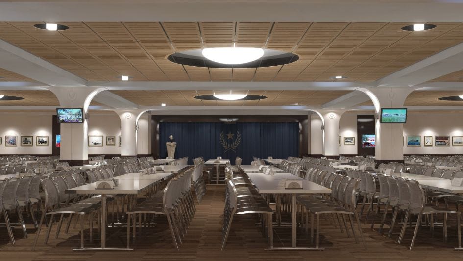 From the lofty heights, we’ll finish up in the basement, where we find the mess halls of the lowly Sea Org members who make all this run — and at only $50 a week, even for 100-hour weeks.