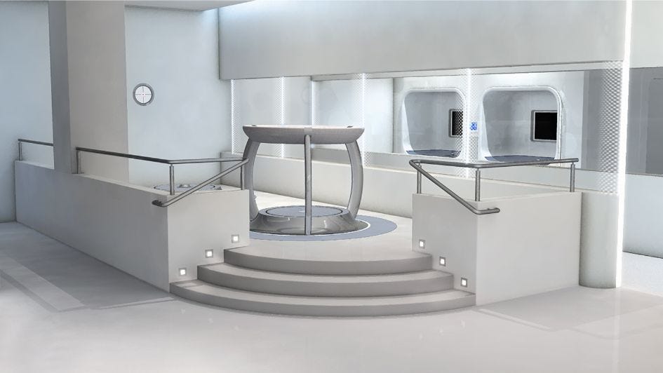 So now we move onto the really special area of the building that looks for all the world like the interiors of the U.S.S. Enterprise. The platforms and equipment you’re going to see have been designed for what Hubbard called “perceptics.” This was another of his made-up words, which he used to describe the human senses — but instead of the five senses that usually come to mind, he came up with 57 of them!
