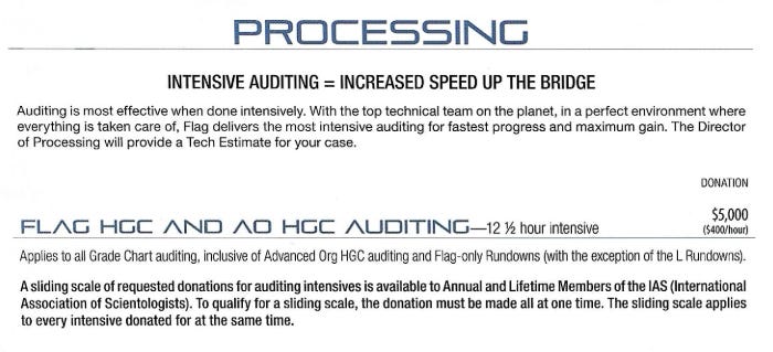 First off, the price list announces that an “intensive” of auditing at Flag is going to run you $5,000. That’s twice what you would pay at a local org back home, according to a price list we posted in 2017.