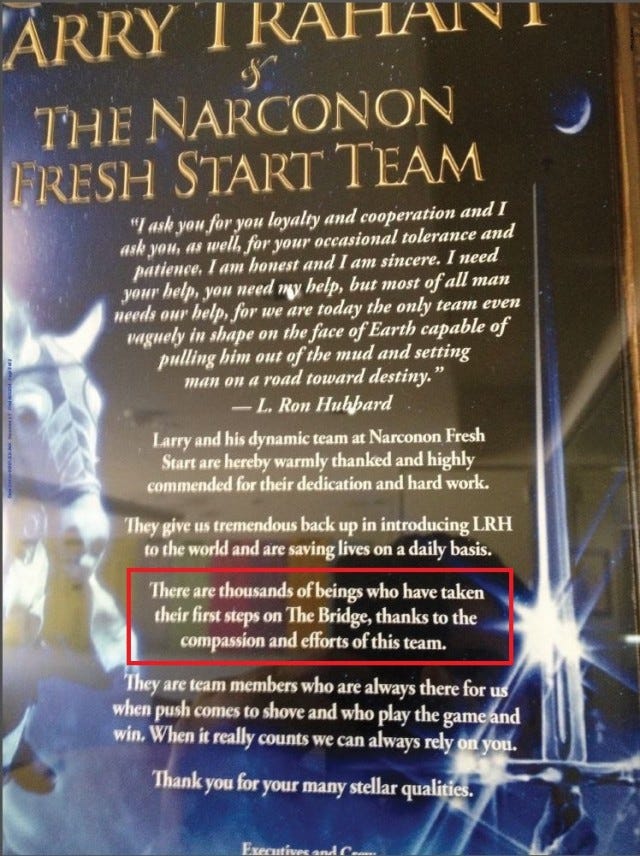 5. David Venemon. In 2019, a man named David Venemon came forward to reveal that he had been behind some of the biggest leaks of information out of Narconon, including a photo of a plaque given to Narconon Fresh Start owner Larry Trahant for helping to recruit so many patients to Scientology’s “Bridge” itself.