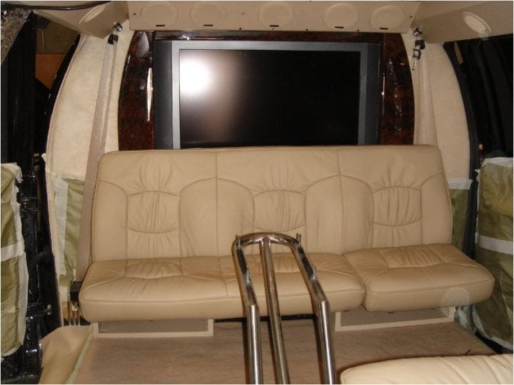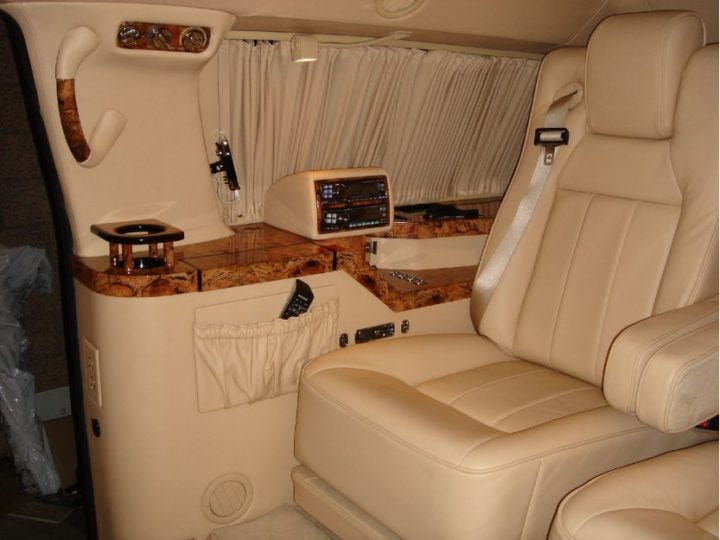 Inside the Excursion, showing the custom work in progress. “The metal contraption in the foreground is supposed to be a mount for a baby seat that goes between Tom and Katie’s seats.”