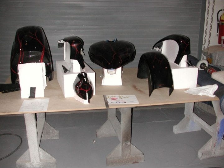 Before he could give the Honda Rune a paint job similar to the one on a David Miscavige bike and the P51 Mustang model, Brousseau first had to strip off the parts of the bike that had a custom War of the Worlds paint job. Brousseau says he refused to paint over this fine work and instead had new parts ordered. The old parts in this photo sit in the Scientology headquarters.