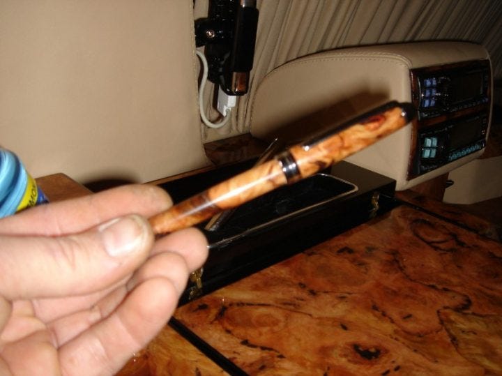 Brousseau says that he even went so far as to create a custom Mont Blanc pen with the eucalyptus wood, and a secret compartment for it in the car. “DM went nuts when he saw this and so did Tom,” Brousseau writes, referring to church leader David Miscavige. “It was completely over the top.”