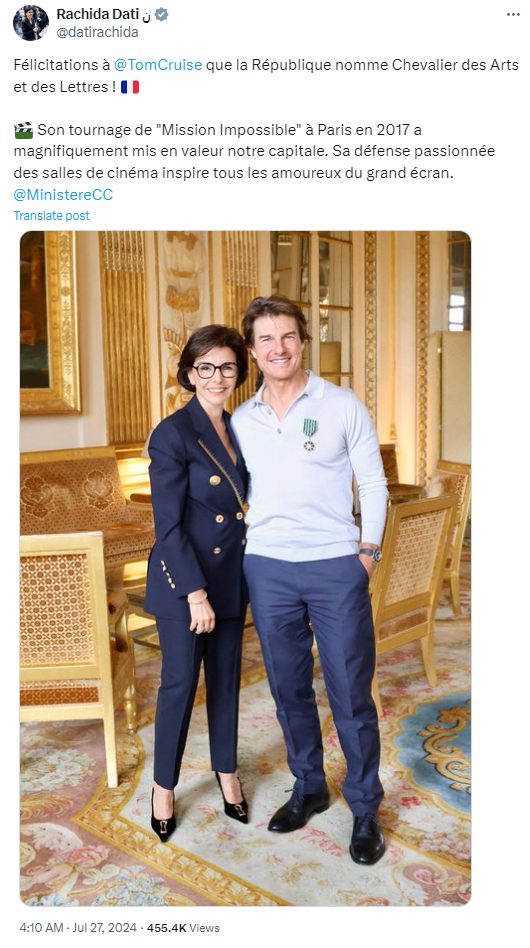 In a secret ceremony that was held just before the opening of the games, actor Tom Cruise was named a Knight of Arts and Letters by France’s minister of culture, Rachida Dati, who announced the award in a tweet early Saturday morning.