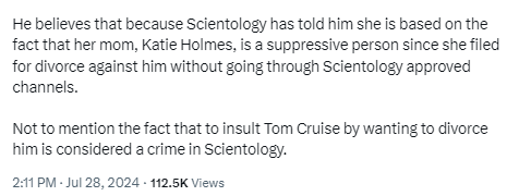 Even if Scientology had formally declared Katie to be an enemy, Tom Cruise is not a regular Scientology member. He’s a celebrity. And in fact, the most important Scientology celebrity of all time. And as a celebrity, Tom would have the ability to ignore those rules and continue to see both Katie and Suri if he wanted to.