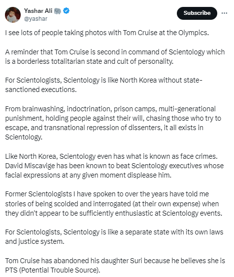 So, here’s what we told the Sun and any other reporter who has asked us about this: If Tom Cruise, as Scientology’s most important celebrity, can ignore Scientology’s rules about suppressive persons, and potential trouble sources, and disconnection and continue to see his daughter, why doesn’t he?
