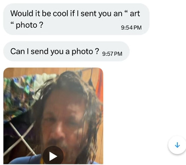 The first read, “Would it be cool if I sent you an ‘art’ photo?” And the second message, three minutes later, “Can I send you a photo?”