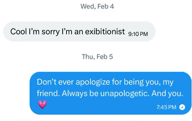 So she responded, “Don’t ever apologize for being you, my friend. Always be unapologetic. And you.” And she included a heart emoji.