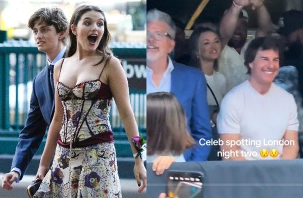 We’re not going to tell you anything you haven’t already seen or heard over the last few days, about how Tom Cruise was trading friendship bracelets and dancing at Taylor Swift’s second sold-out night at Wembley Stadium in London Saturday, while he was missing what was going on back in New York, where his daughter Suri attended her high school prom this week with boyfriend musician Toby Cohen, and then graduated from La Guardia High School, which had her name listed as “Suri Noelle” in the graduation program.